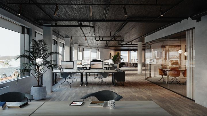 不多加裝飾的天花板,單一的水泥墻,木質(zhì)桌面,鐵質(zhì)柜子等都能凸顯出辦公空間冷靜、理性的空間氛圍,整體空間空曠但沒有壓迫感。