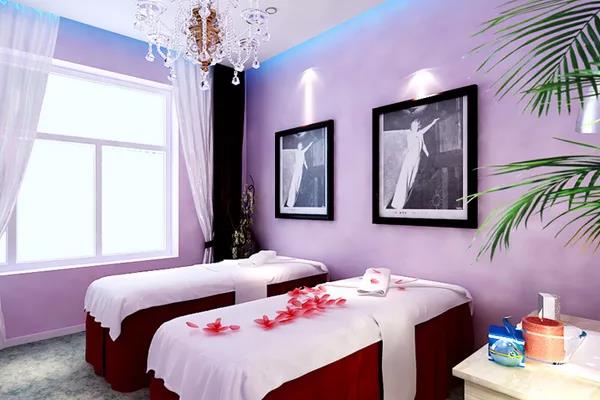 浪漫現代風 浪漫的紫色元素是很多美容院的大愛。這件美療房就主要采用了紫紅色作為主色調。從裝修方面來說,其實并不復雜,只添加了水晶吊燈和裝飾畫作為點綴,墻壁則是純紫色的墻紙。床上套件以及窗簾選擇了紅色,色調依次遞增,凸顯出色彩的層次感,不至于落入俗套。