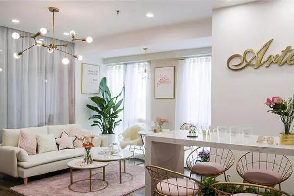 粉嫩的風格十分符合年輕人的審美,美容院大廳整體采用白色作為主色調,只不過將地毯、抱枕、高腳凳、掛畫等裝飾物加入了粉色元素進行點綴,營造出浪漫甜蜜的室內空間。簡單的吧臺設計充滿跳脫感,青春氣息十足,吊燈、裝飾畫、擺件的選擇都極富情調,特色鮮明。